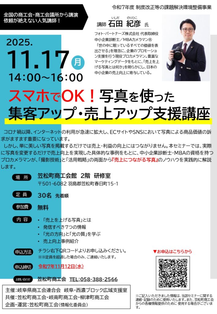 (笠松町商工会からのお知らせ)スマホでOK!写真を使った集客アップ・売上アップ支援講座 参加者募集のご案内