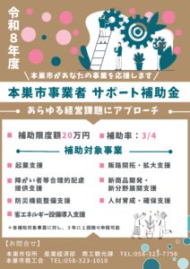 ※本巣市事業者サポート補助金 募集要領など詳細は下記URLの本巣市HPをご確認ください。