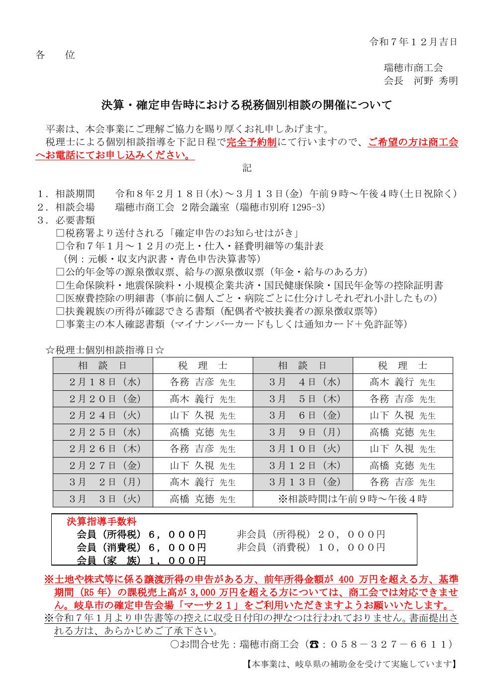 (瑞穂市商工会からのお知らせ)確定申告 税務個別相談の開催について