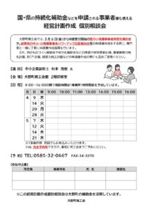 大野町商工会では、3月6日(金)から申請受付開始の国の小規模事業者持続化補助金や、岐阜県の中小・小規模事業者パワーアップ応援補助金の申請書作成をする際に、専門家と一緒に丁寧に申請書作成指導を行います。