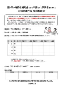 大野町商工会では、3月6日(金)から申請受付開始の国の小規模事業者持続化補助金や、岐阜県の中小・小規模事業者パワーアップ応援補助金等の申請書作成をする際に、専門家と一緒に丁寧に申請書作成指導を行います。
