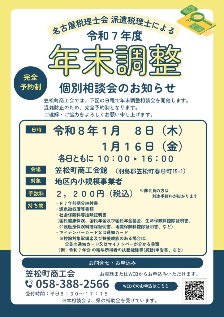 笠松町商工会では、名古屋税理士会より派遣された税理士による「年末調整 個別相談会」を開催します。小規模事業者の皆さまを対象に、年末調整に関する疑問点や手続きの進め方などを個別で相談いただけます。混雑防止のため、全日程とも完全予約制です。