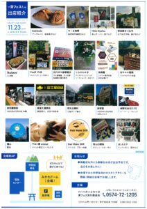 焼き菓子、珈琲、高山ラーメン、古代米を使った五平餅、たこ焼き、ホットドック・ポテトなどキッチンカーも出店します。