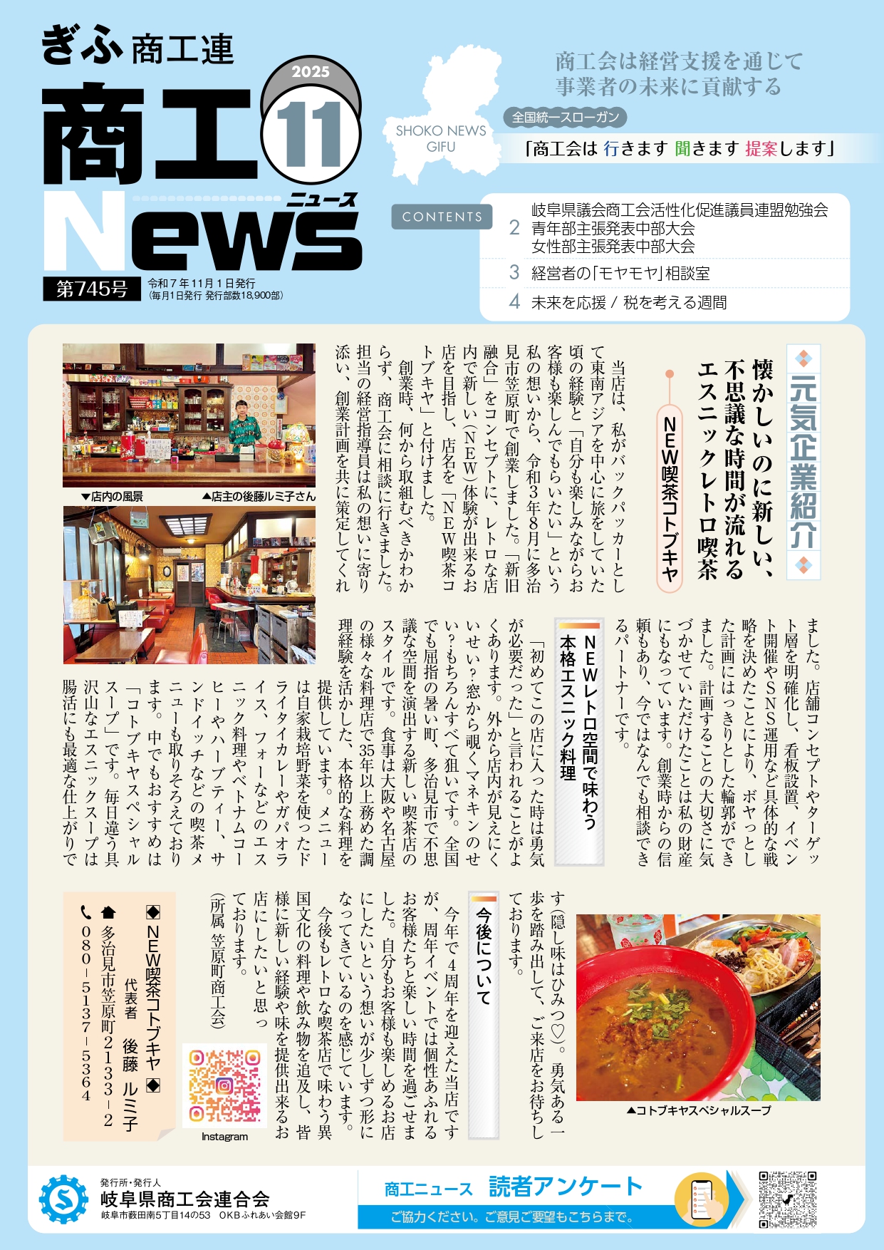 岐阜県商工会連合会が毎月1日に発行している「ぎふ商工ニュース」の11月号に、弊会会員事業者の「NEW喫茶コトブキヤ」様が掲載されました。「NEW喫茶コトブキヤ」様の販路開拓に向けた取り組みや今後の展開について掲載されていますので、ぜひご覧ください。