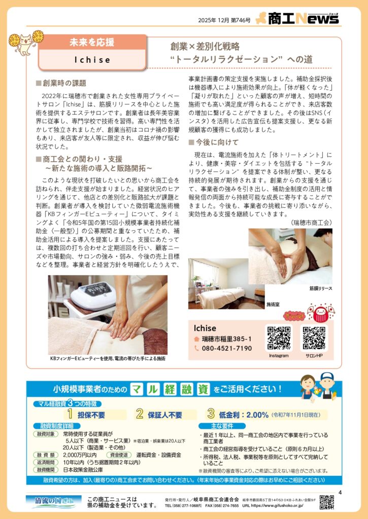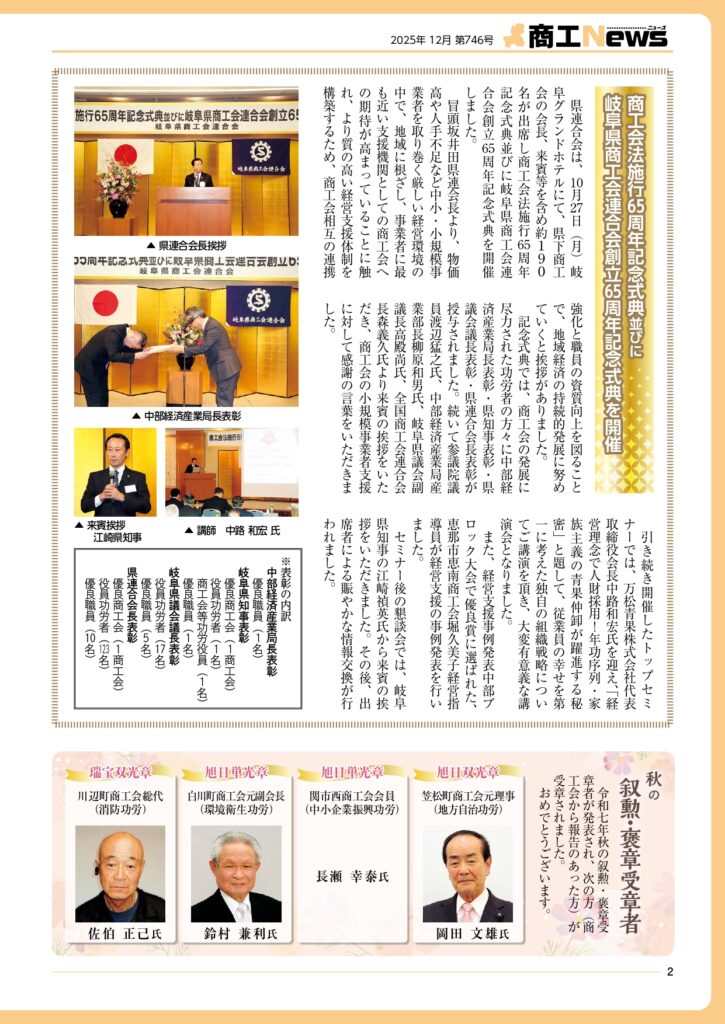 岐阜県商工会連合会は、県内商工会の活動や中小企業支援情報を紹介する機関誌「商工ニュース」令和7年12月号を発刊しました。経営に役立つ情報や各地の商工会の取組事例などを掲載しております。ぜひご覧ください。