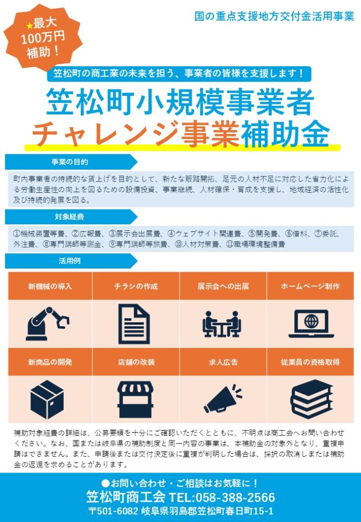 (笠松町商工会からのお知らせ)笠松町小規模事業者チャレンジ事業補助金公募のお知らせ