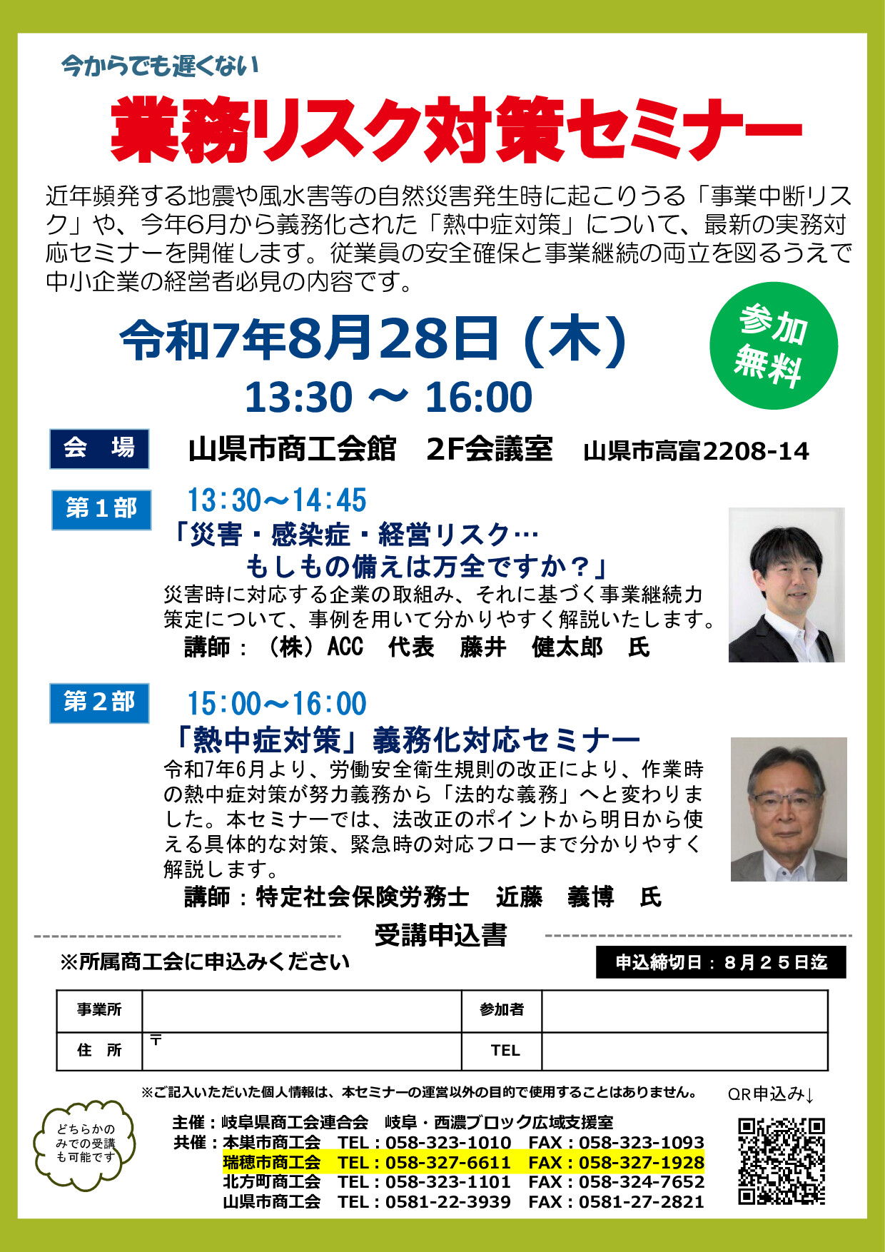 商工会では、近年頻発する地震や風水害等の自然災害発生時に起こりうる「事業中断リスク」や、今年6月から義務化された「熱中症対策」について、最新の実務対応セミナーを開催します。