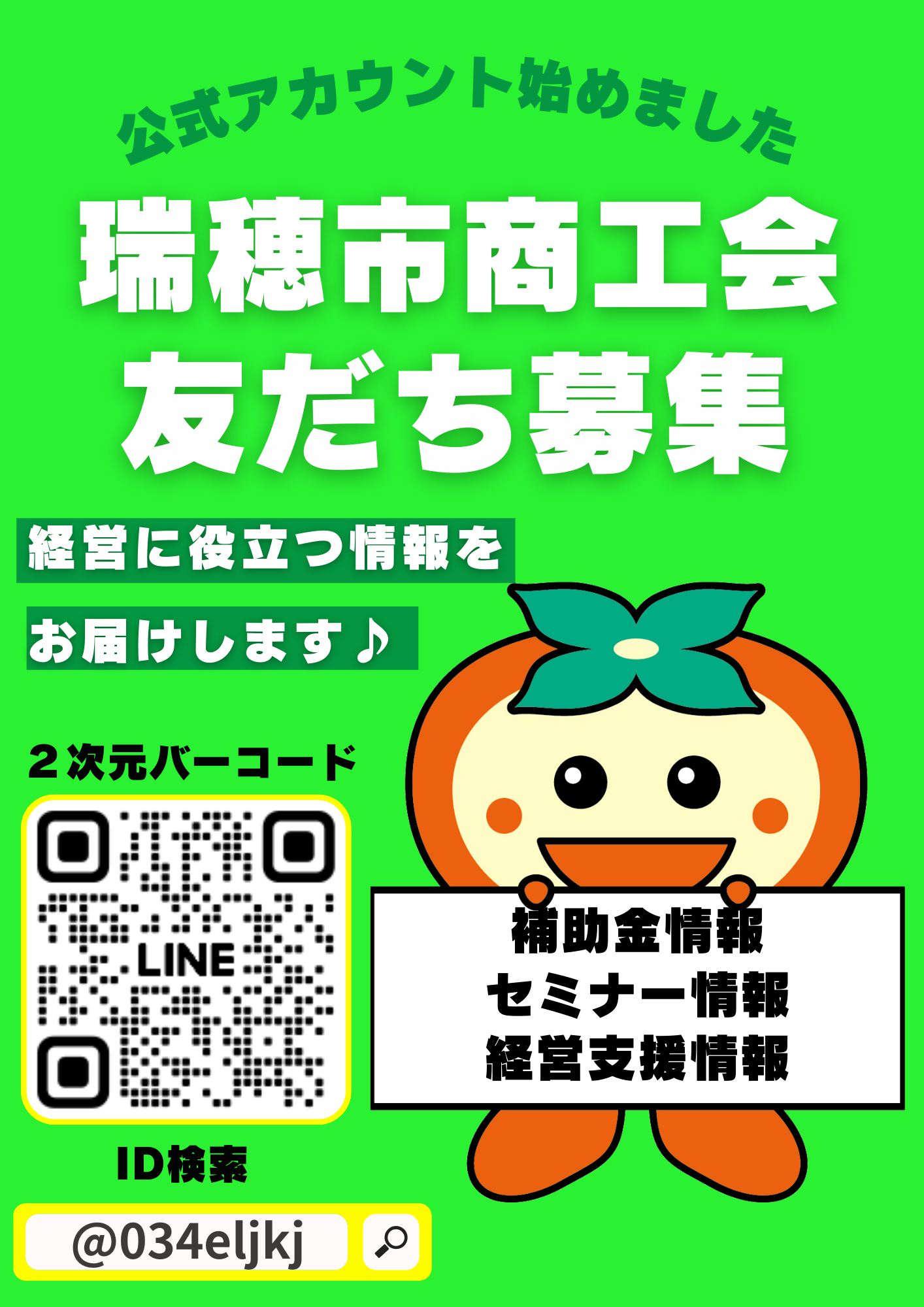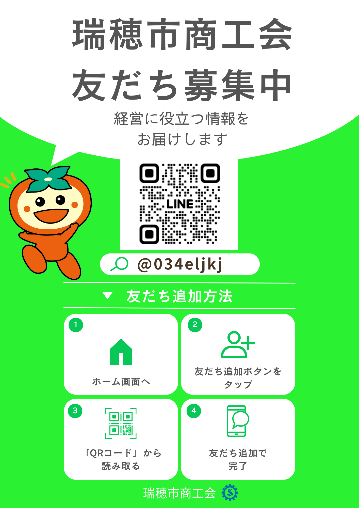 1.LINEを起動し、画面左下「ホーム」を選択 2.ホーム画面右上の「友だち追加」マークを選択 3.「検索」を選択し、「ID検索」となっていることを確認 4.文字を入力する画面になれば「@034eljkj」を入力 5.アカウント名「瑞穂市商工会」を確認 6.「追加」を選択し、友だち登録完了です。 |