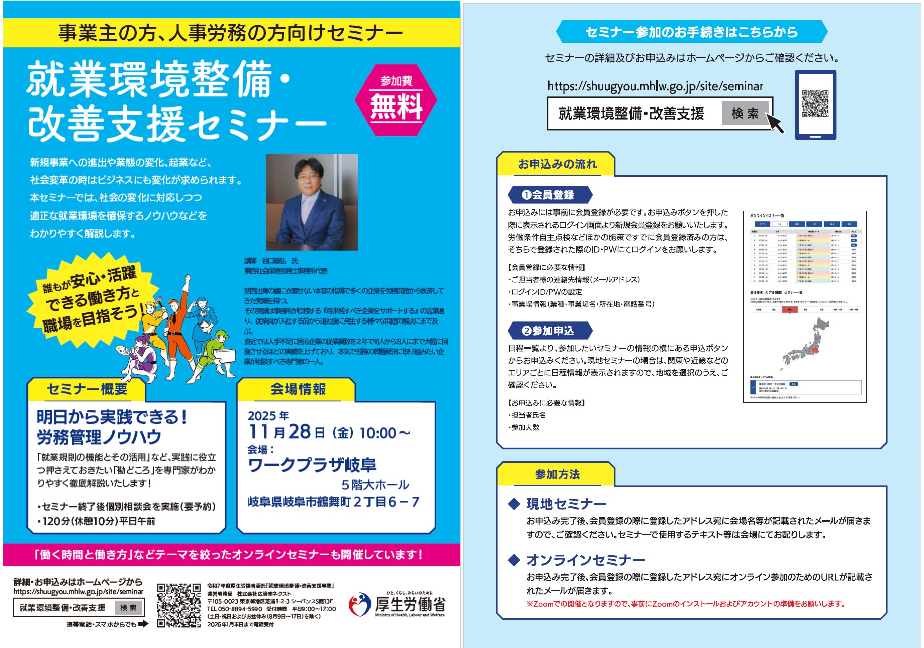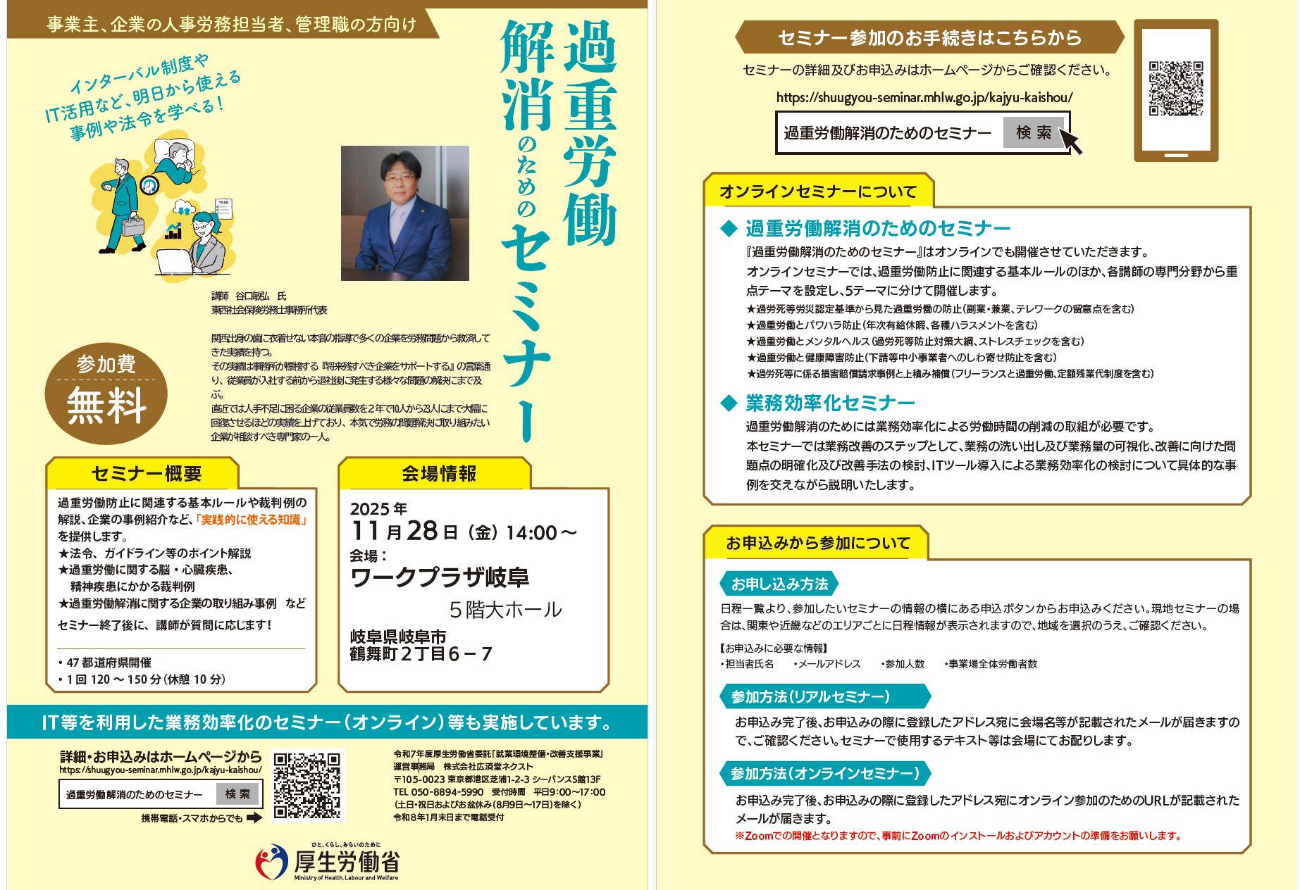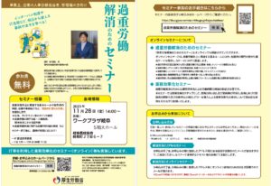 岐阜県労働基準協会連合会は、厚生労働省の委託を受け、株式会社広済堂ネクストと連携し、下記のとおり「就業環境整備・改善支援セミナー」と「過重労働解消のためのセミナー」を開催されます。