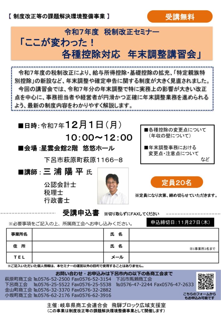 今回の講習会では、令和7年分の年末調整で特に実務上の影響が大きい改正点を中心に、事務担当者や経営者が円滑かつ正確に年末調整業務を進められるよう、最新の制度内容をわかりやすく解説します。