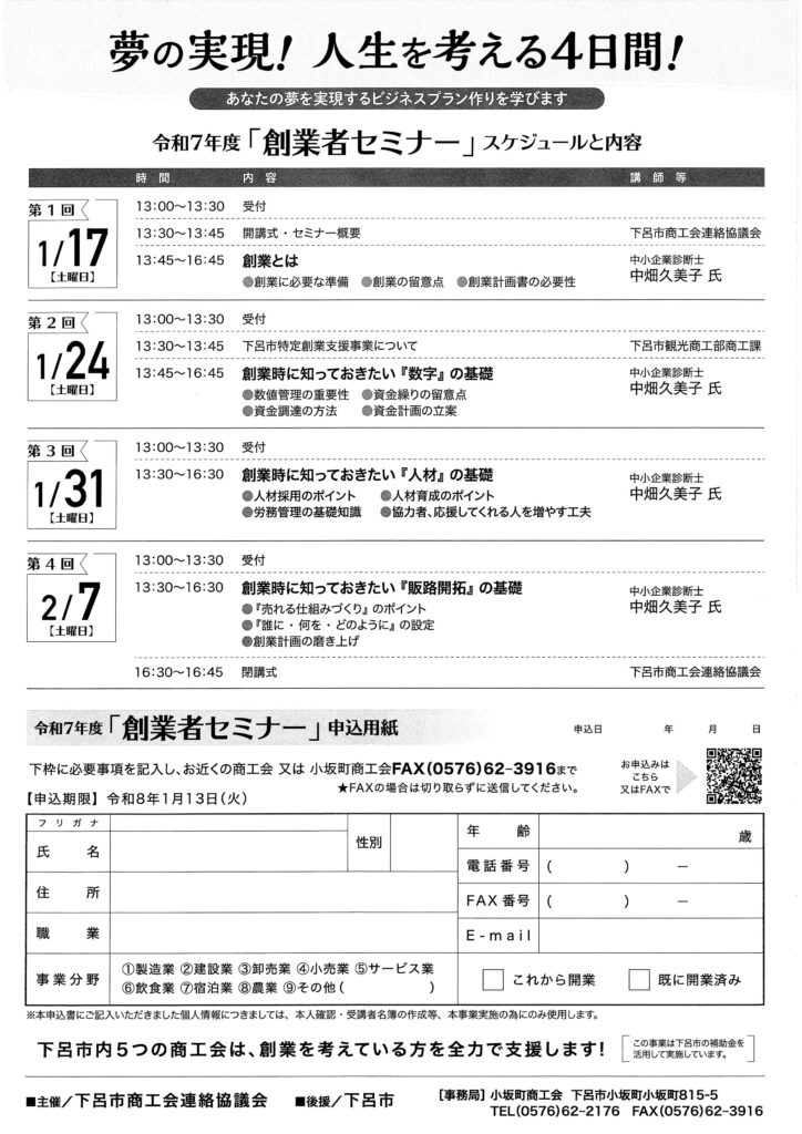 下呂市にある5つの商工会が共同で創業者向けセミナーを開始します。