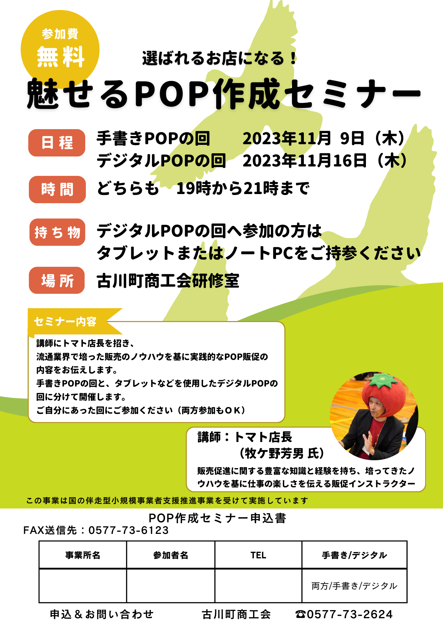 講師にトマト店長をお招きし、流通業界で培った販売のノウハウを基に実践的なPOP販促の内容をお伝えします。ペンやマジックで書く手書きPOPの回と、タブレットやノートPCを使用したデジタルPOPの回に分けて開催。ご自分にあった回にご参加ください(両方参加してもOKです)